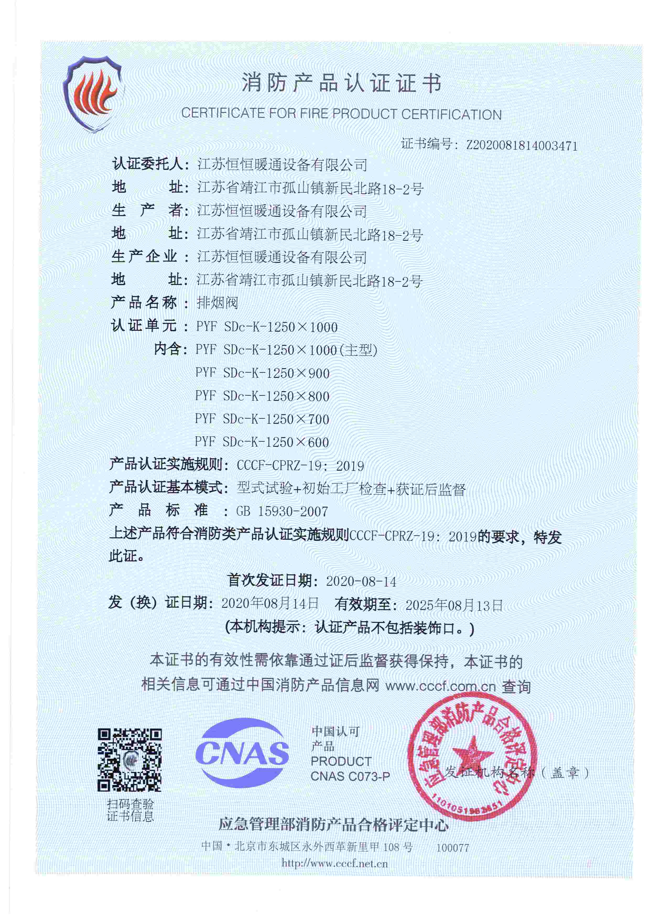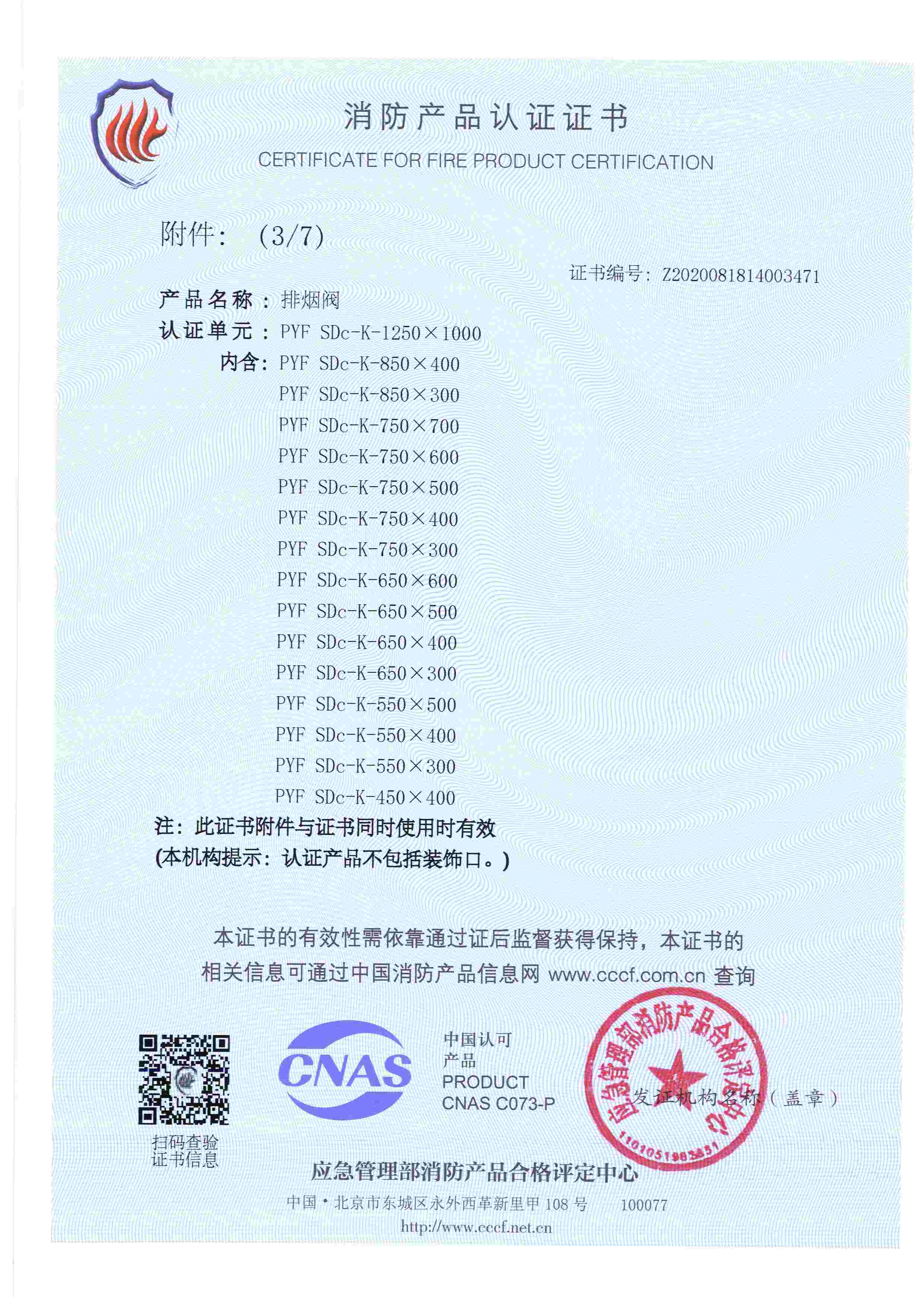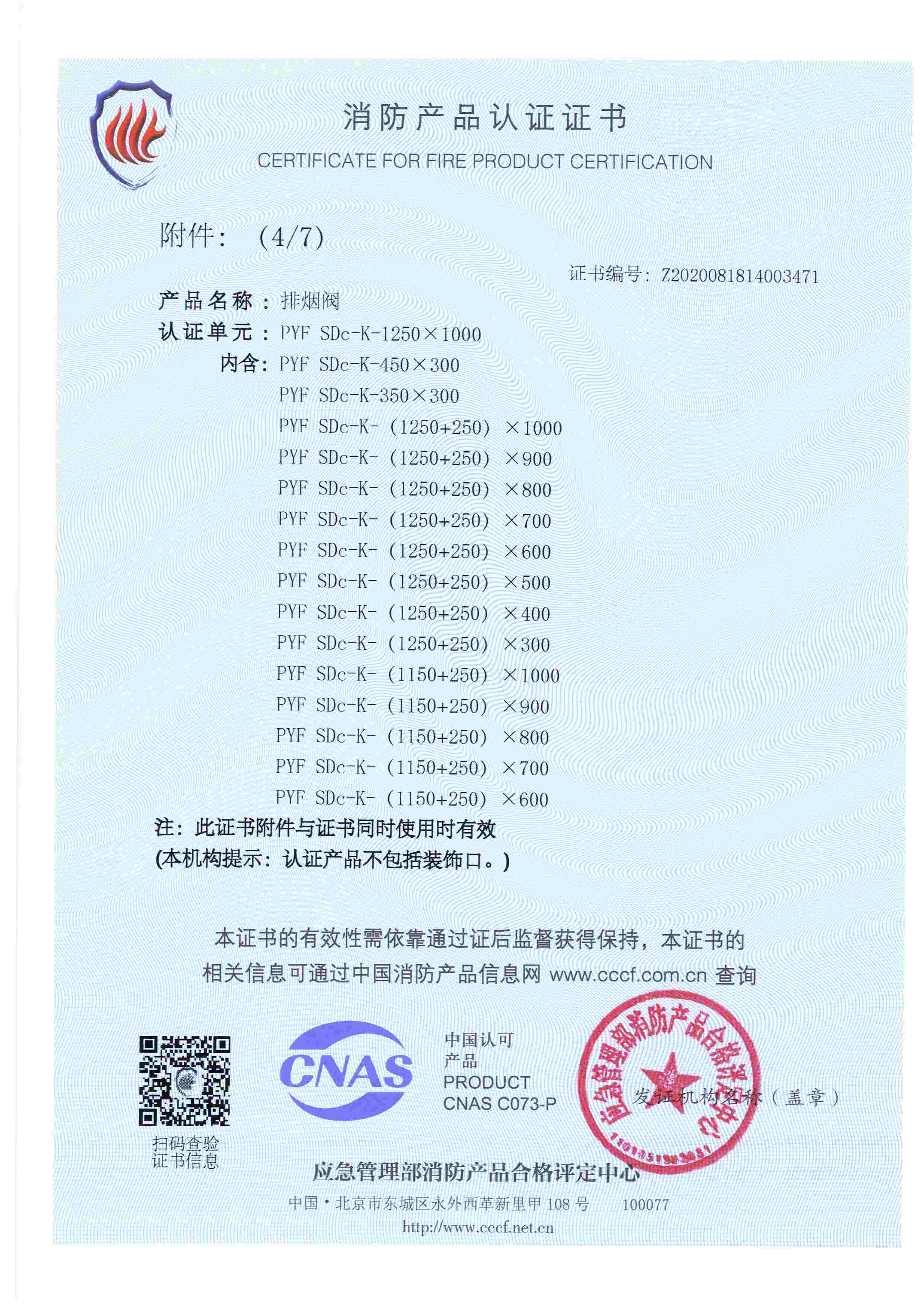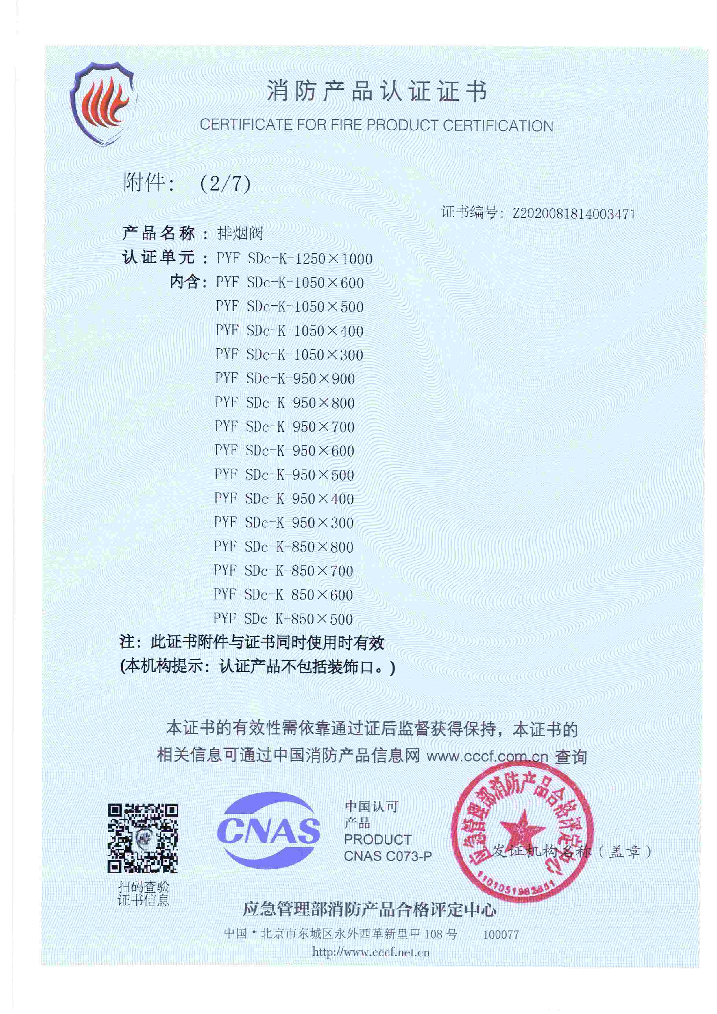 排煙防火閥認證證書2000X1000